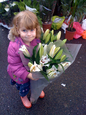 My daughter carrying a massive bunch of flowers with the same name as her.